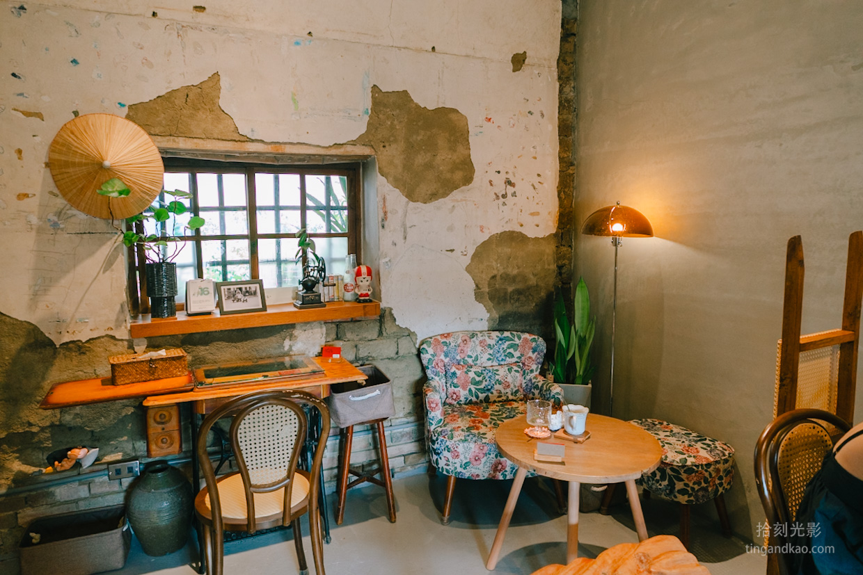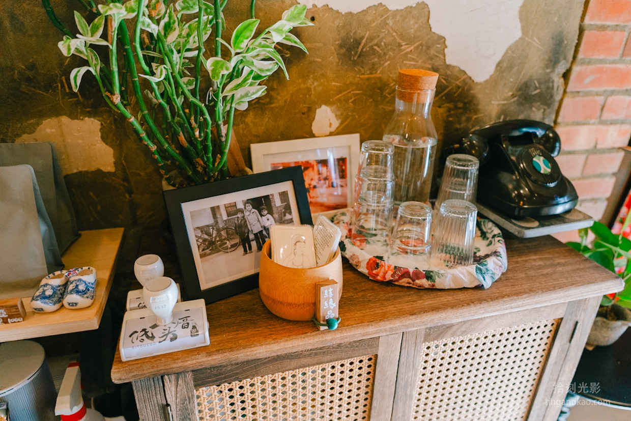 我們被安排到室內座位區,空間也布置得很有氣氛。使用紡織機當作桌子、花布沙發和藤椅,擺飾也可以看見具有年代感的商品,像是大同寶寶娃娃、汽水瓶等。室內空間座位不多,大約四桌的座位,空間特意保留老屋的痕跡,帶入生活感。