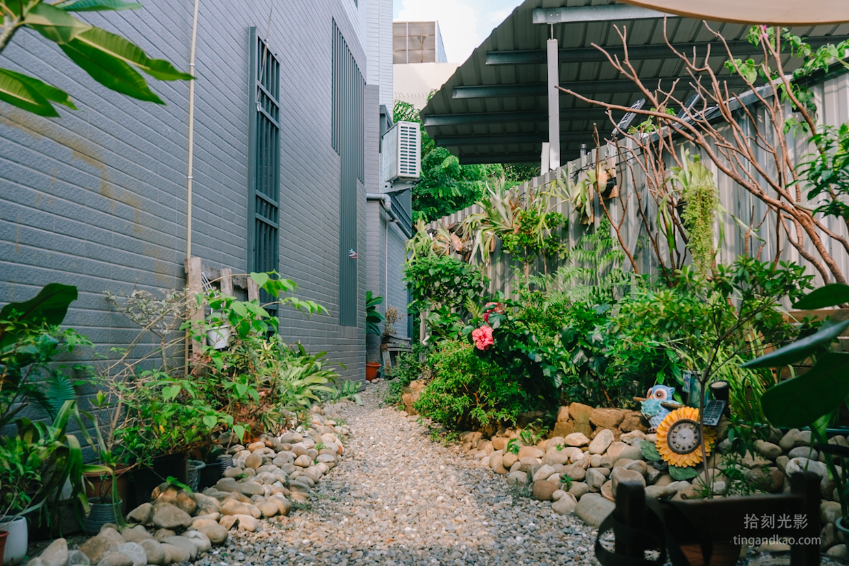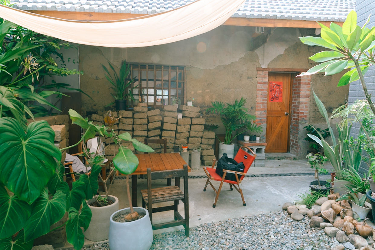 低頭厝咖啡後院的空間也設有座位區,後院布置許多綠植和花園。但戶外只有電扇,在夏天還是太熱了,等待天氣涼快一些,必能好好享受戶外空間。