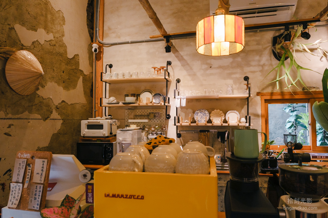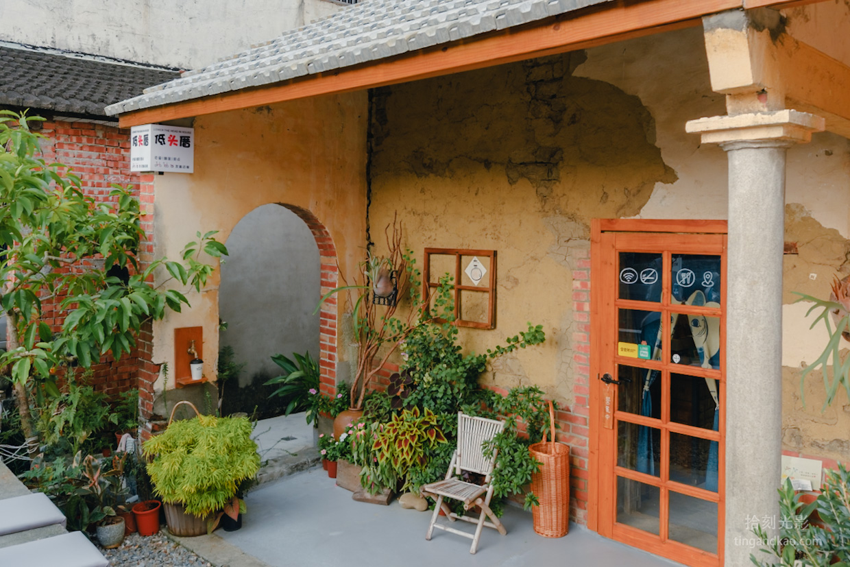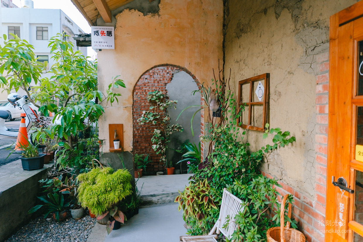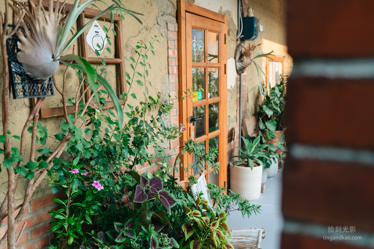 小小的咖啡廳從門口就能感受到老闆的用心,門口有許多植栽和擺飾。建築外觀保留紅磚和土角厝特色,非常古色古香。