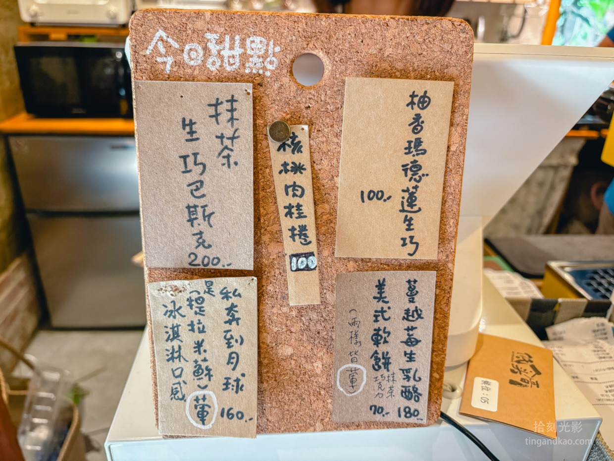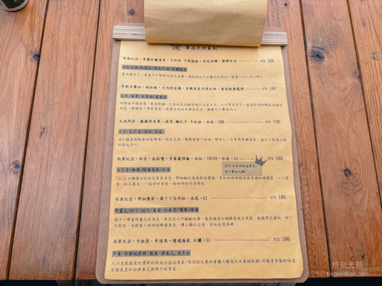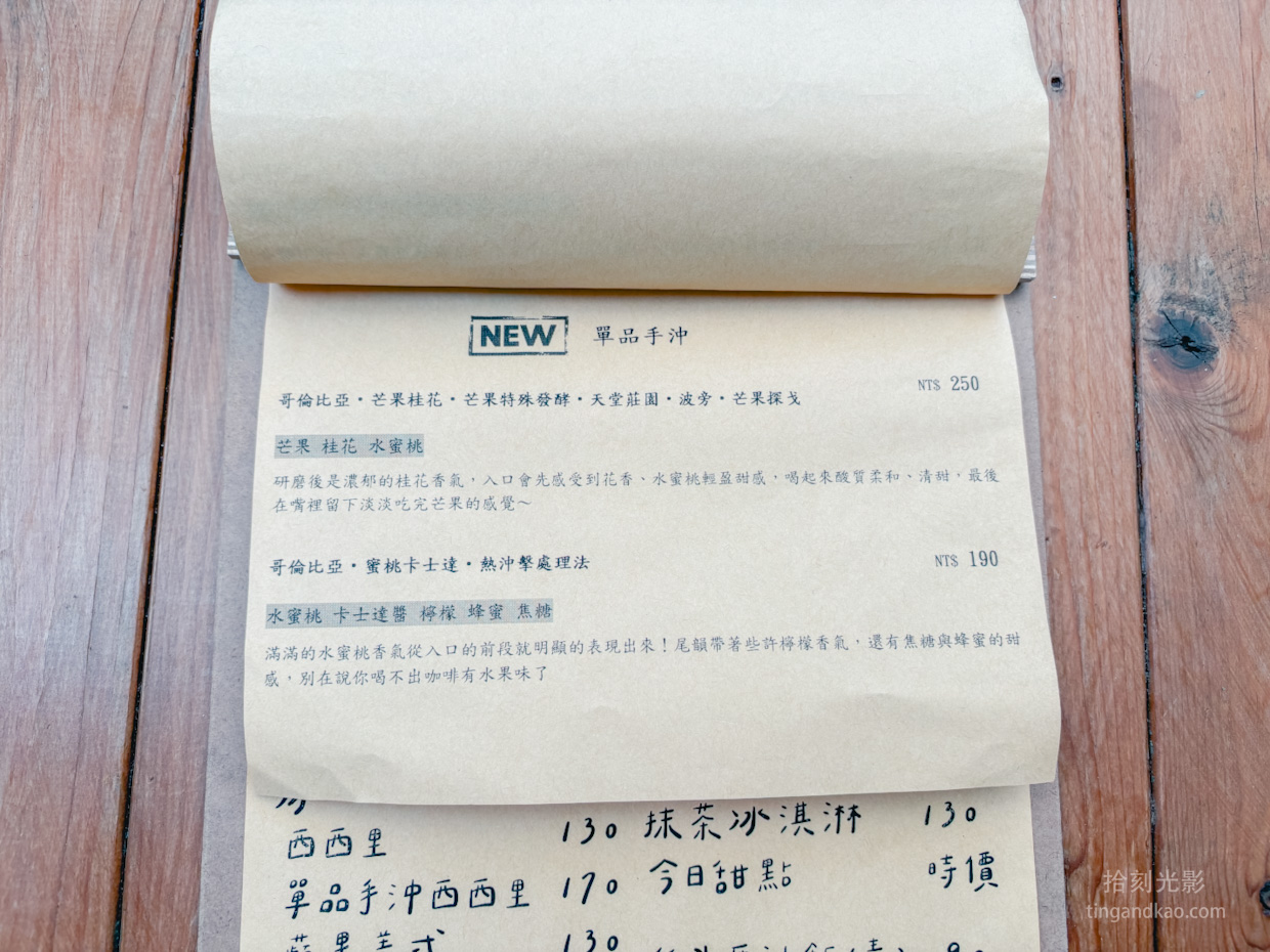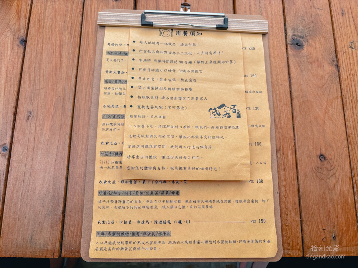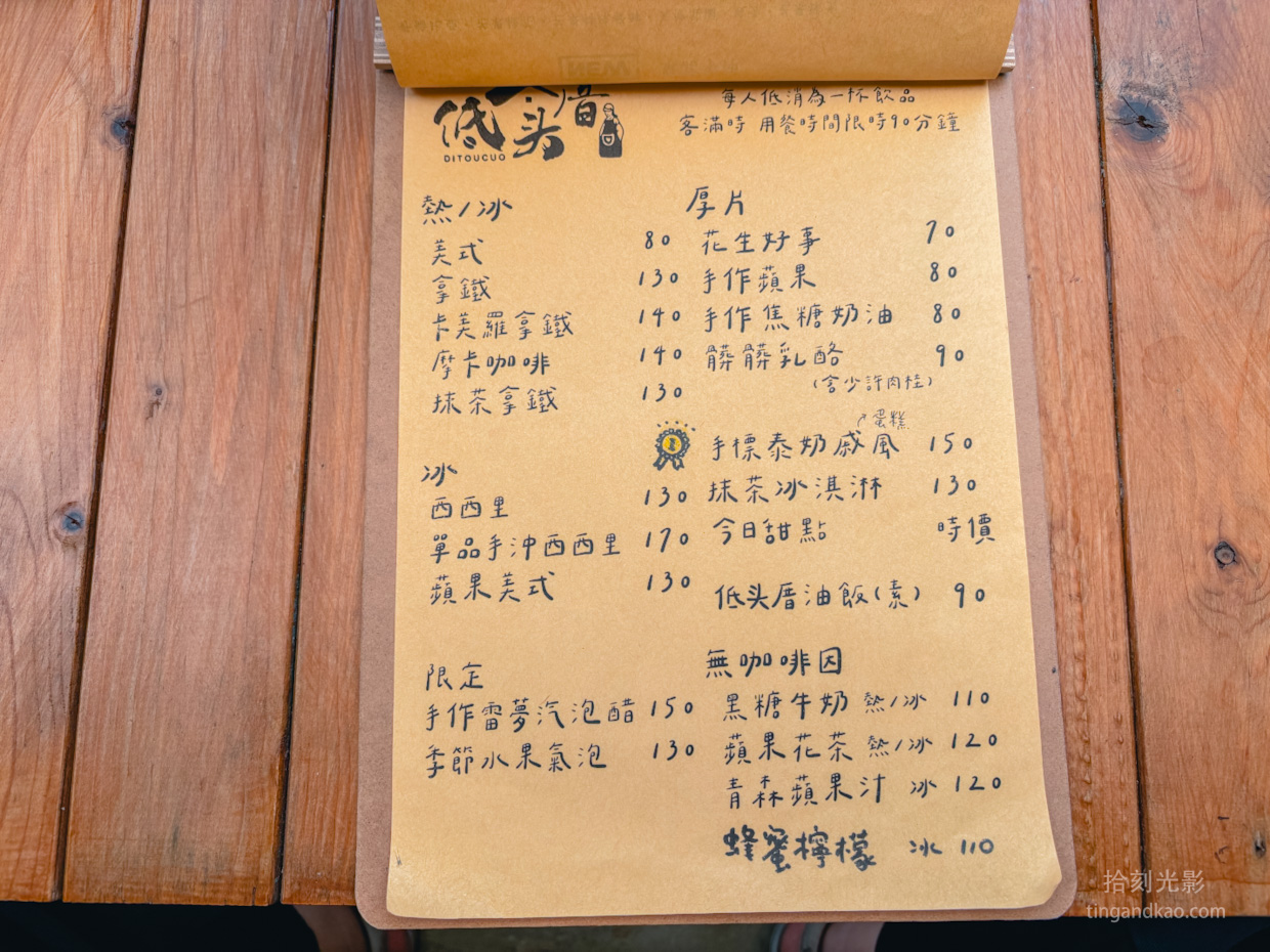 低頭厝咖啡的菜單如下,店內低消為一人一杯飲品。販售飲品有單品手沖、拿鐵、氣泡水、西西里、無咖啡因飲品等,甜點的部分則有厚片、戚風蛋糕和每日甜點。