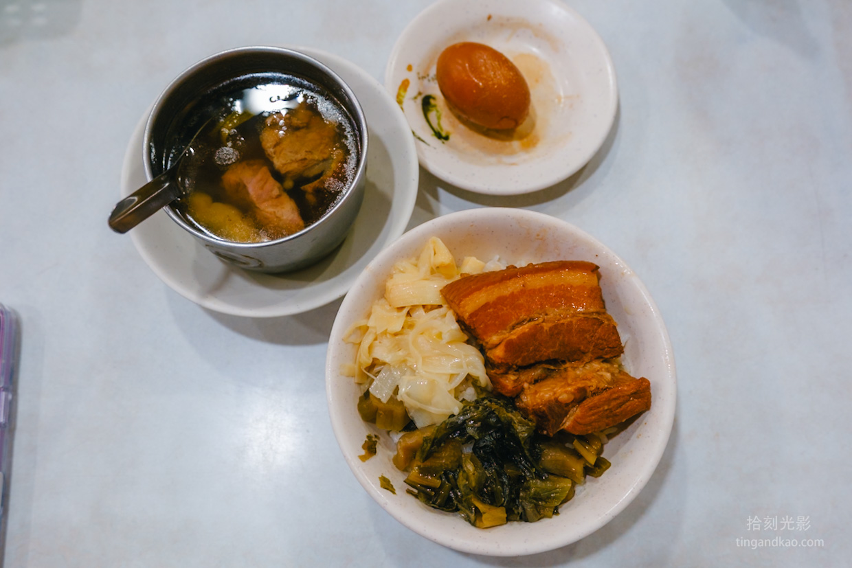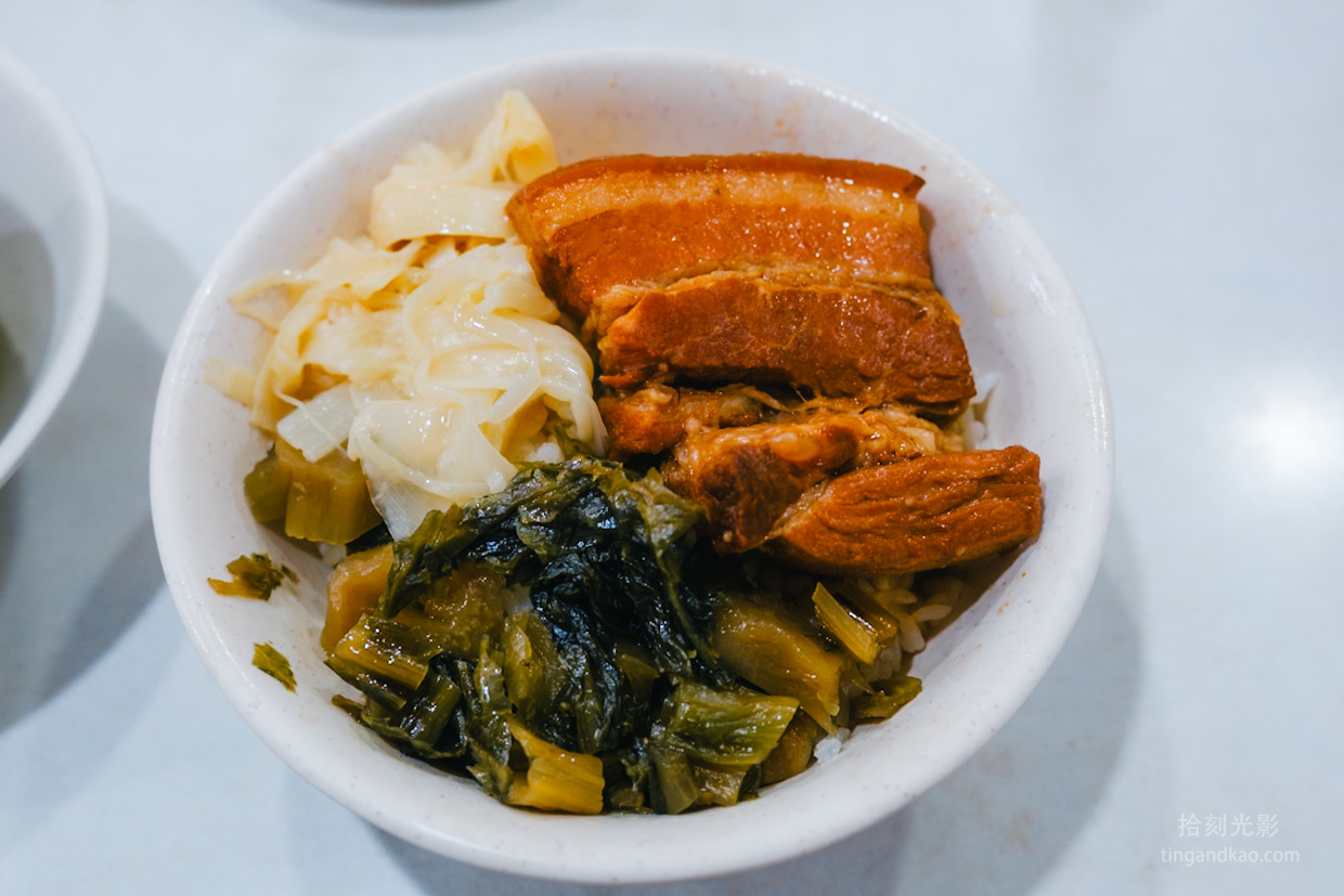 爌肉飯的配菜有酸菜和筍絲,爌肉可以選擇肥肉多的或是瘦肉多的。
