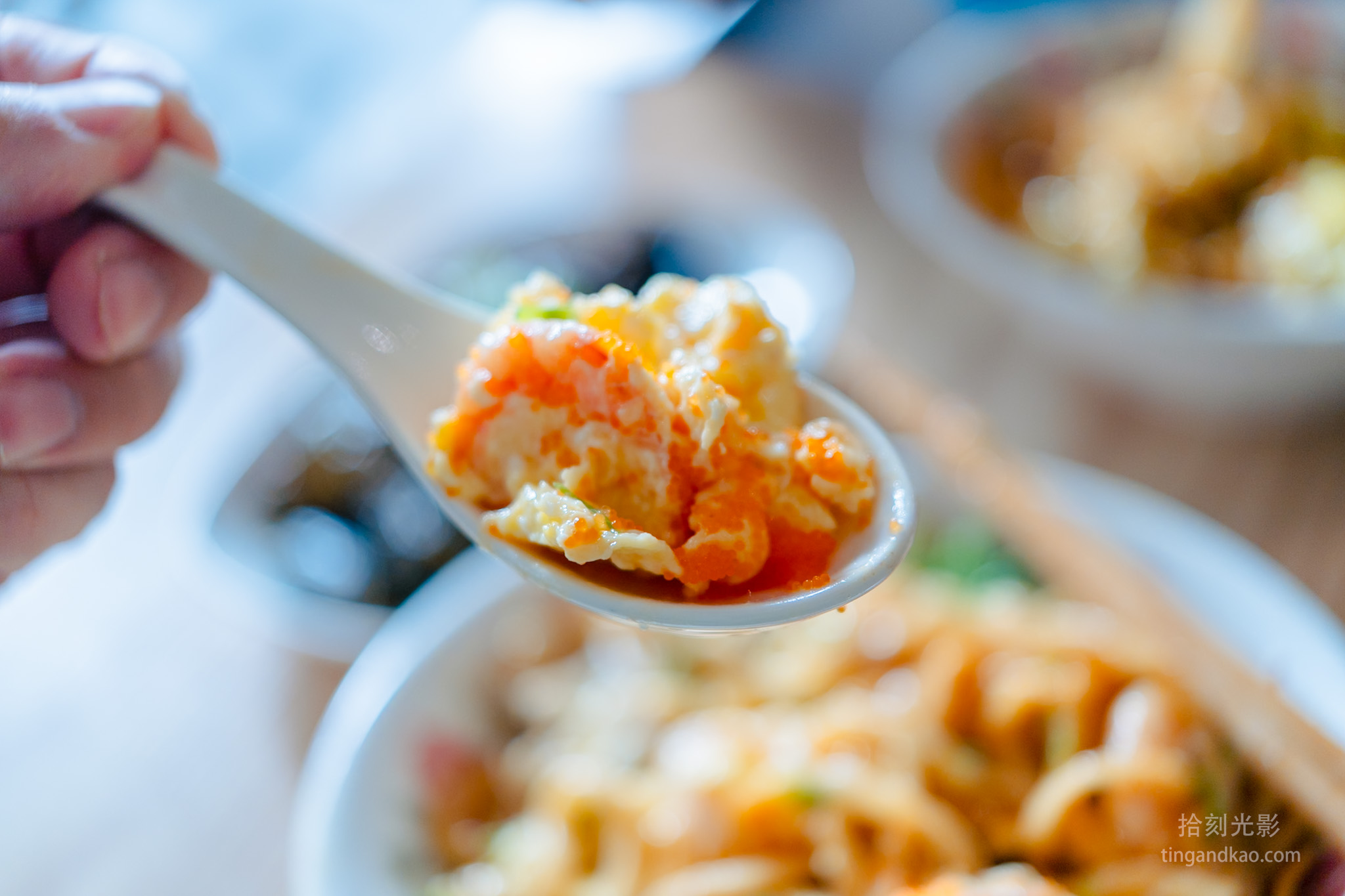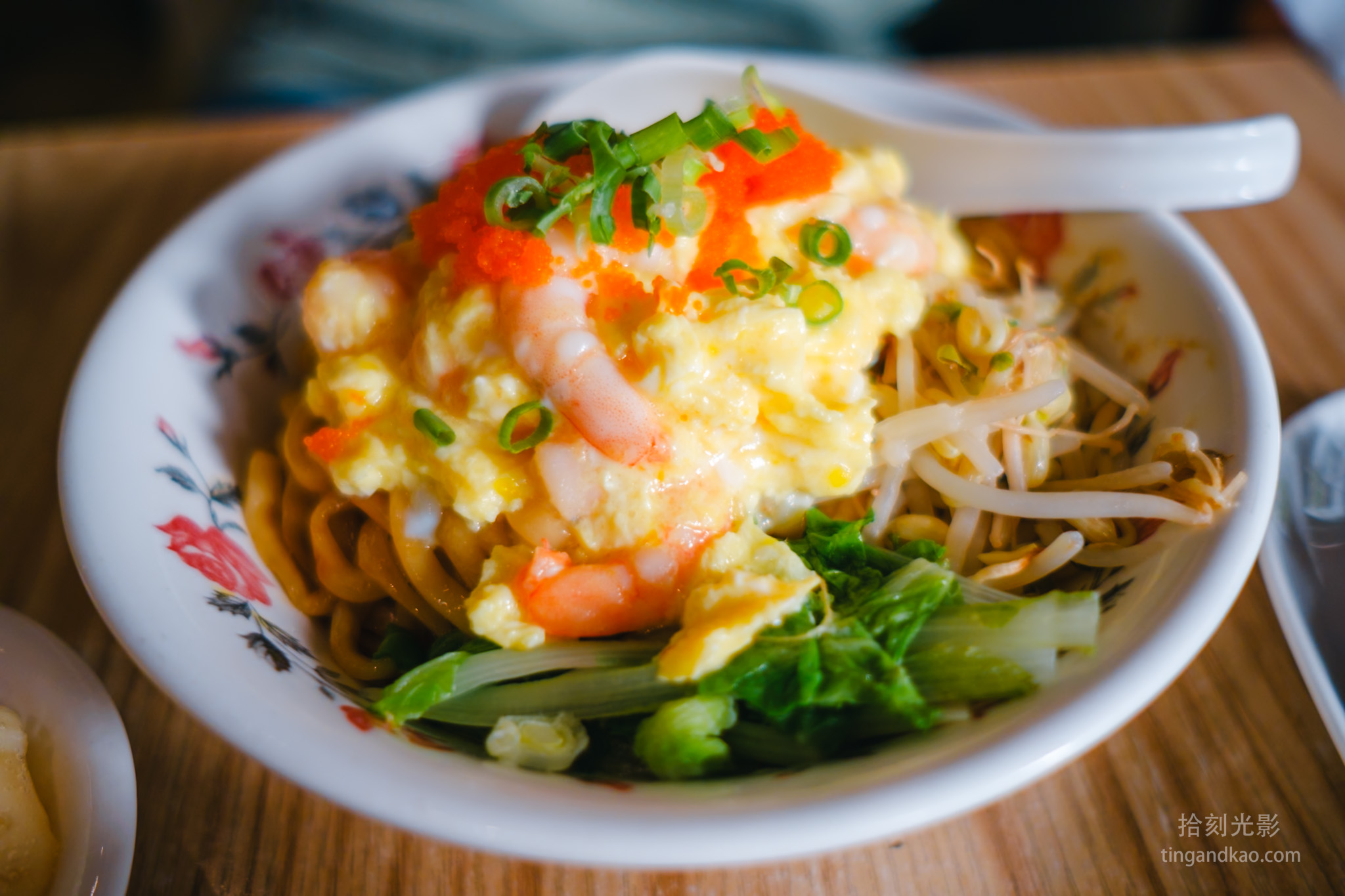 這是一道特別的拌麵,麵條上鋪有鮮嫩的滑蛋和蝦仁,頂部點綴著鮭魚卵。是一道營養豐富的料理,入口滑順,鮭魚卵為整體增添了獨特的口感層次,相當特別。