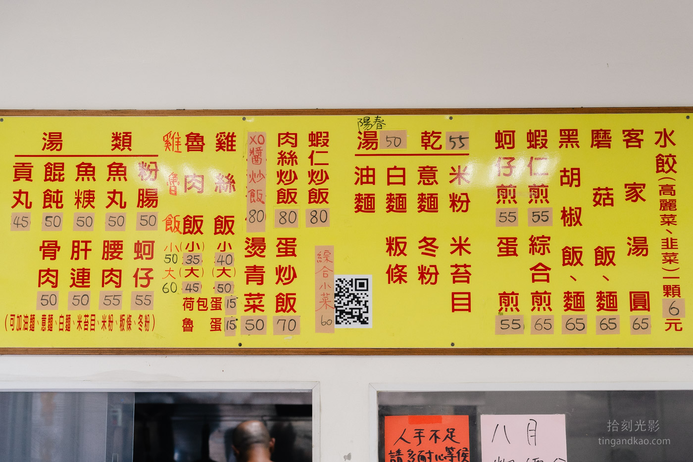 餐點種類多元,有湯類、飯類、乾麵、湯麵、客家湯圓、水餃等,提供各式小吃選擇。