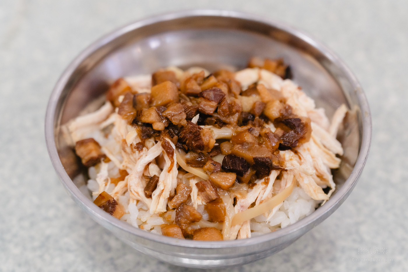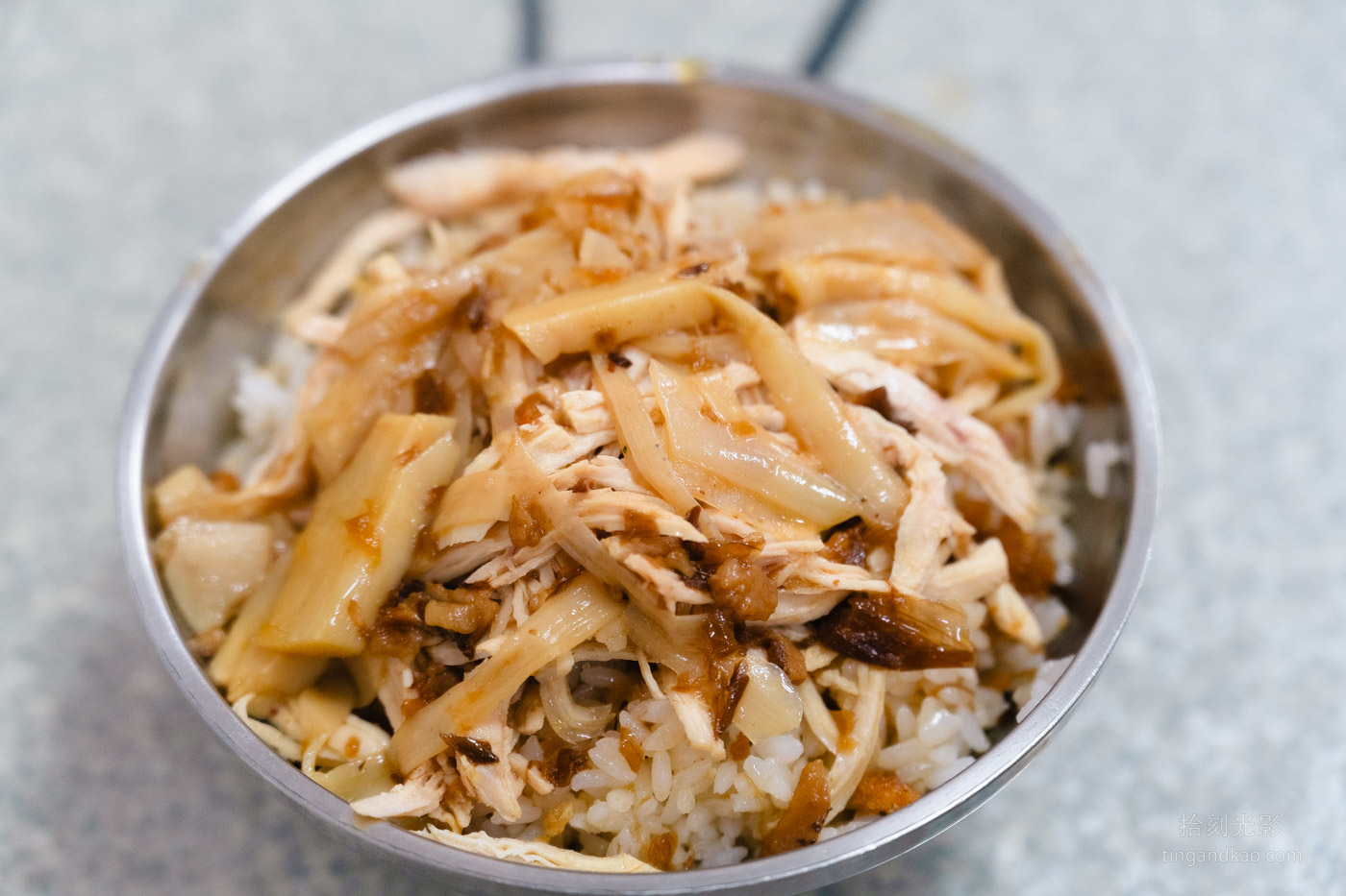 雞絲飯鋪上滿滿的雞絲外還有加上筍絲,並用紅蔥頭調味,香氣十足。