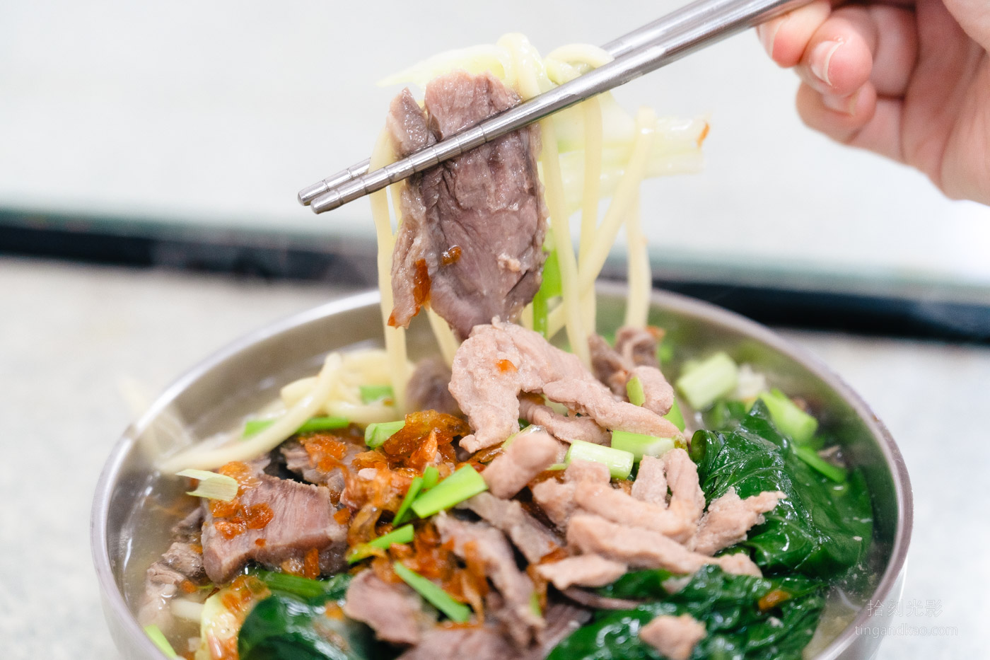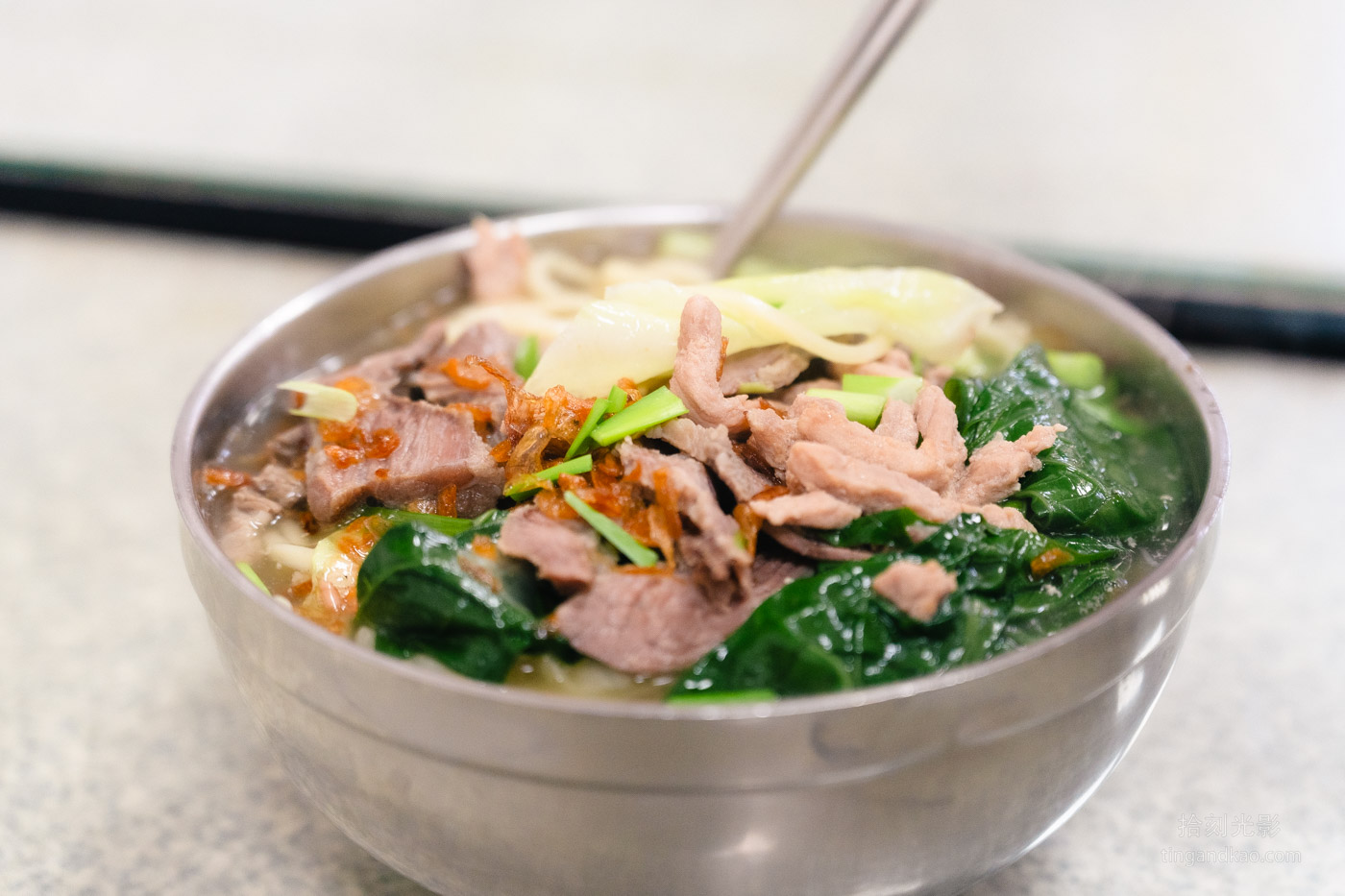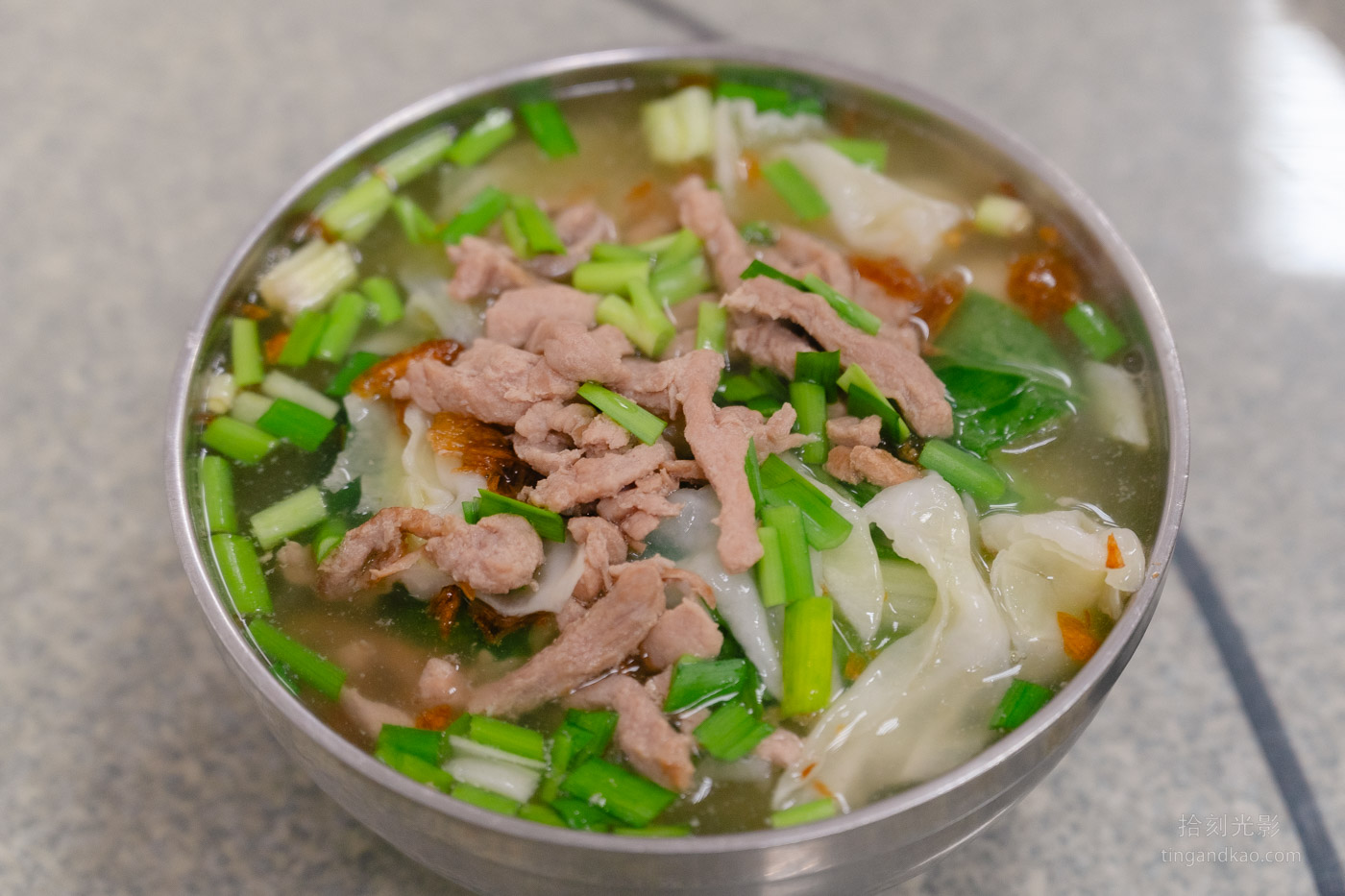 骨肉湯麵很大一碗,麵條選擇黃麵。麵的配菜不是幾根菜而已,而是豐富的菜量,骨肉給的很大塊這一點值得推薦。使用油蔥和韭菜調味,使得湯頭夠味。