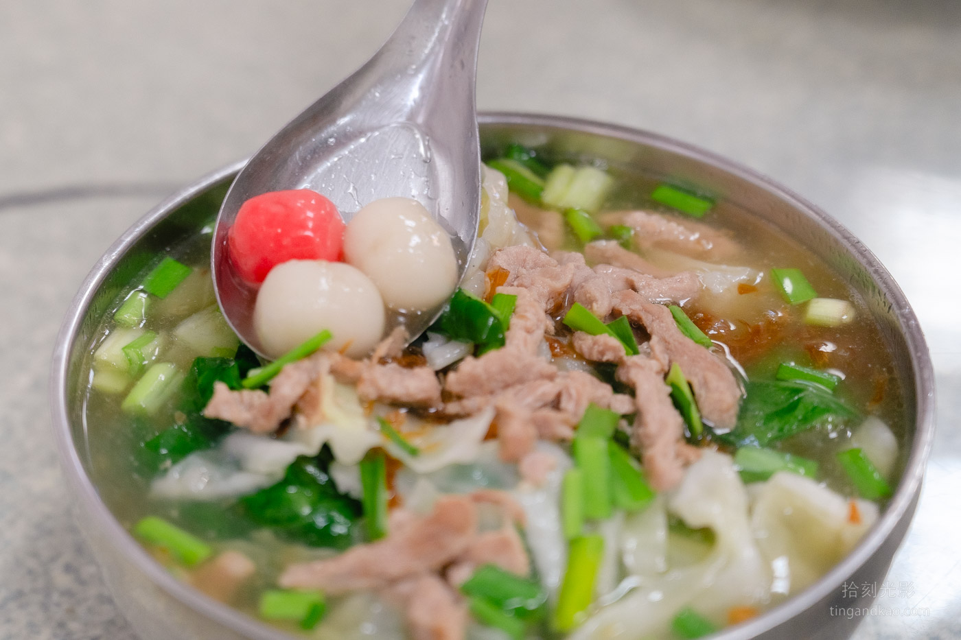 小吃店比較少賣的客家湯圓,在這裡可以吃到。滿滿一大碗,裡頭有許多蔬菜、肉絲和韭菜。湯圓是紅白色的小湯圓,吃起來QQ軟軟的。