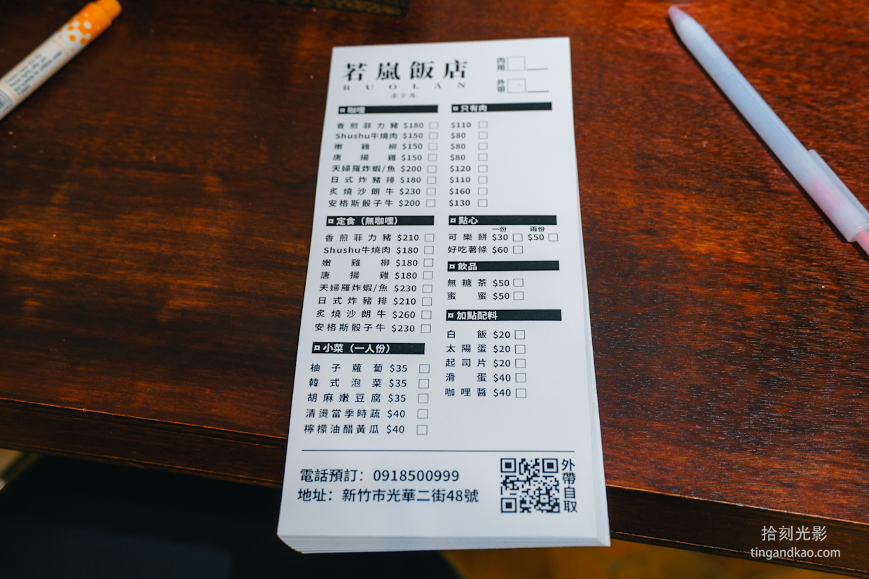 若嵐飯店菜單如下,提供咖哩、定食、單點肉品、小菜、點心、飲料,並可加點配料。
