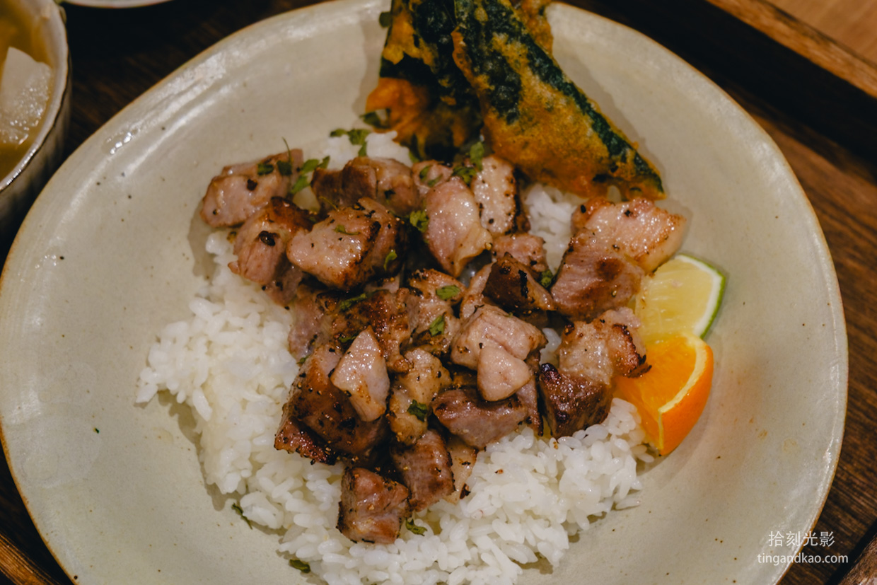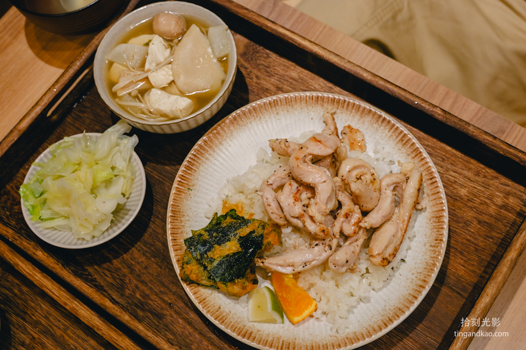 套餐份量十足,嫩雞柳給得很多,軟嫩入味,米飯香Q。一旁附上炸紫蘇葉(推測)、檸檬和柳橙切片。