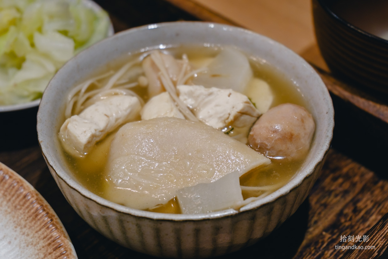 套餐另附高麗菜和一碗滷菜。高麗菜清爽解膩,滷菜內容豐富,有白蘿蔔、豆腐、金針菇、杏鮑菇和貢丸。