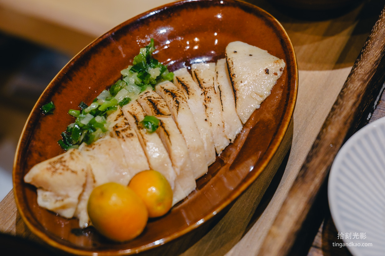 用餐到一半,老闆招待了菜單上沒有的嫩雞片,附上蔥末和金桔調味。嫩雞非常軟嫩,上面帶有些許油脂,口感滑順。