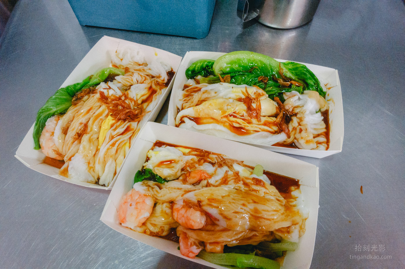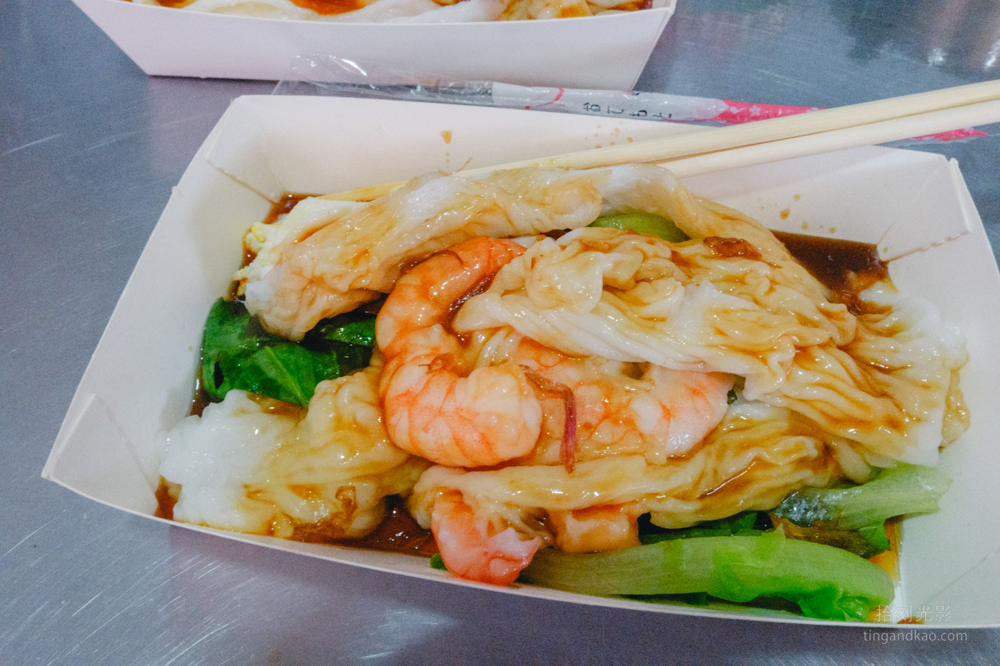 鮮肉蛋腸粉,使用豬肉和少許青菜搭配,淋上特製醬料和紅蔥頭;鮮蝦腸粉將豬肉換成蝦仁,蝦仁還滿大的約有3-5隻。