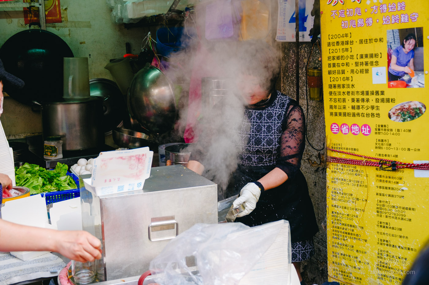 店內一旁的看板記錄著店家歷史:老闆娘於2004年嫁到台灣,2015年開始在中和經營廣東腸粉生意,2016年搬遷到淡水經營至今。老闆娘也將製作技術傳授給學生開設分店,而淡水這間正是創始店。。