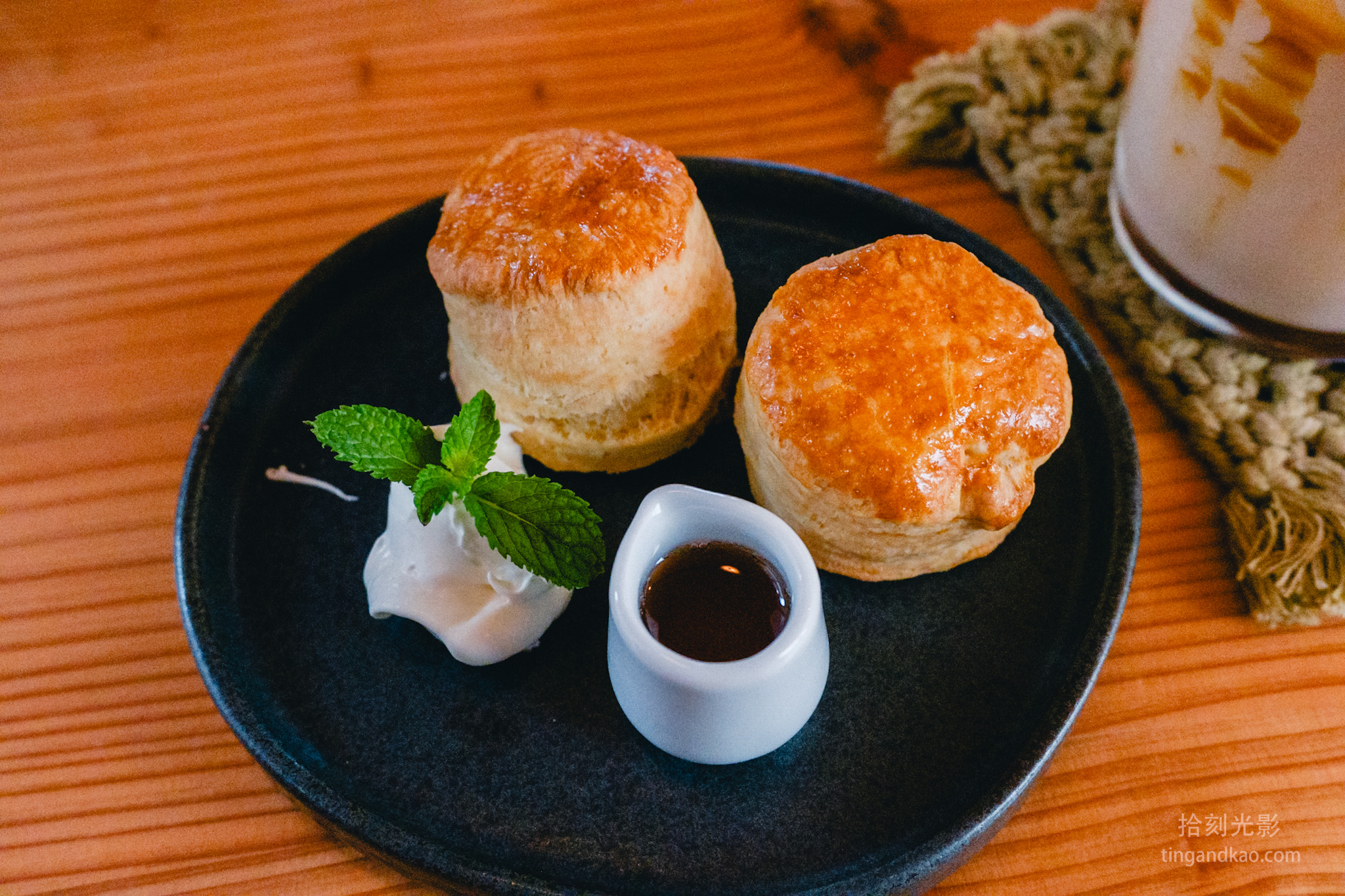 自製司康外酥內軟,端上來時還熱呼呼的。附上鮮奶油可以沾著吃,也有提供蜂蜜。