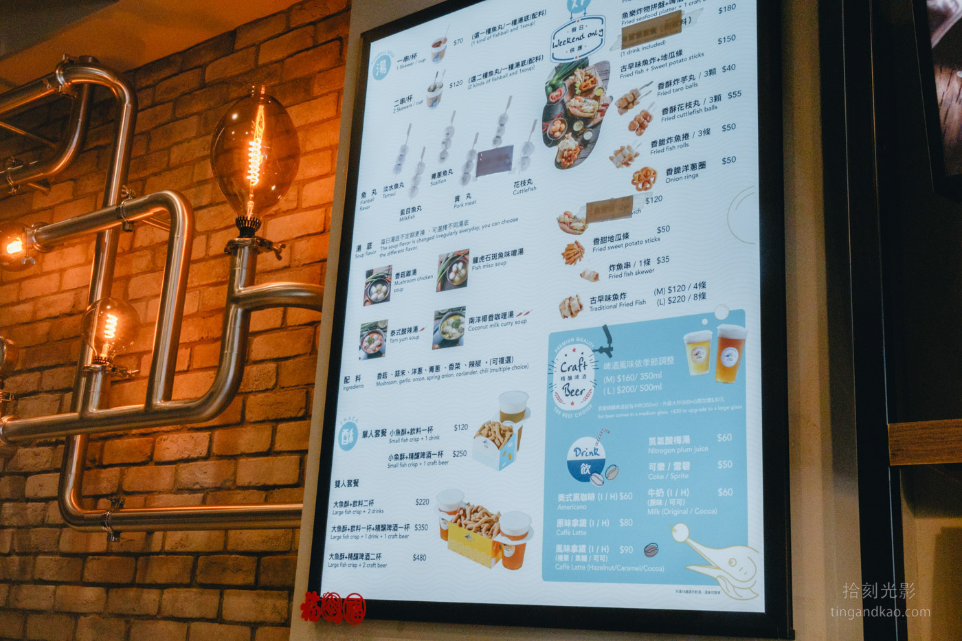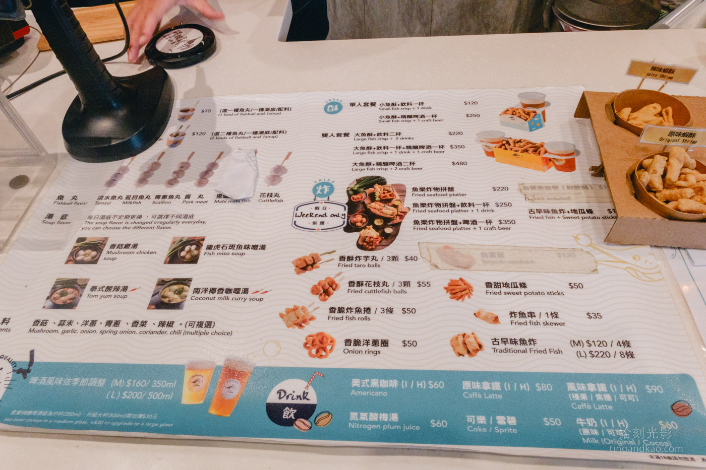 登峰魚酥的菜單如下圖所示,提供熟食、炸物、湯品以及精釀啤酒、咖啡、汽水等多樣選擇。顧客需先至櫃檯點餐,店家會提供震動取餐器,接著顧客可進入店內尋找座位入座等候。