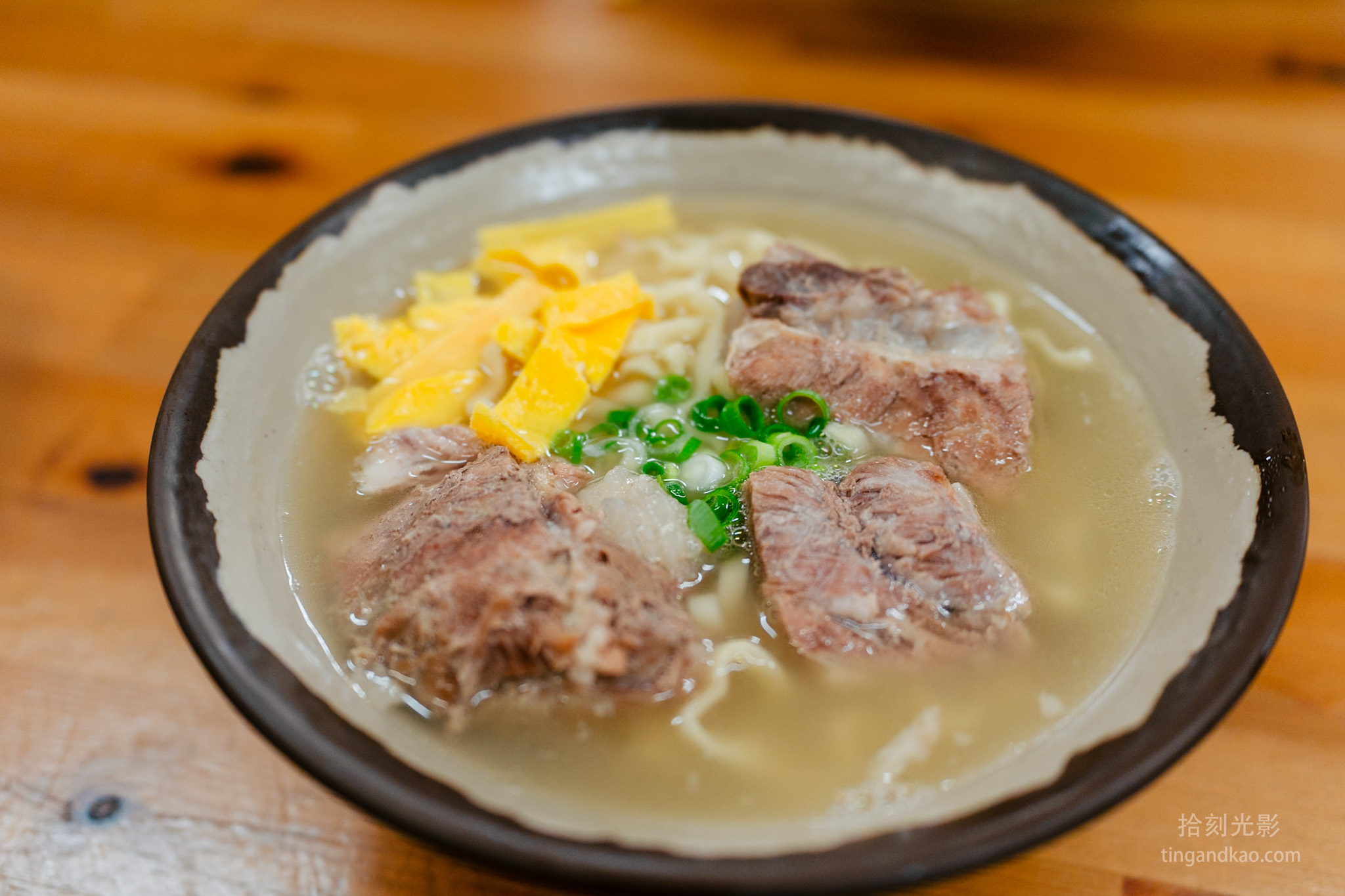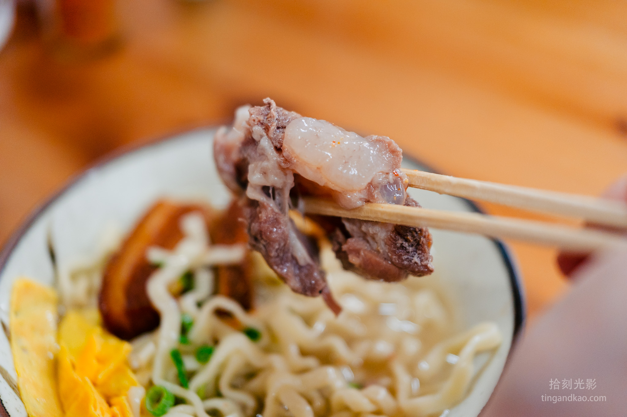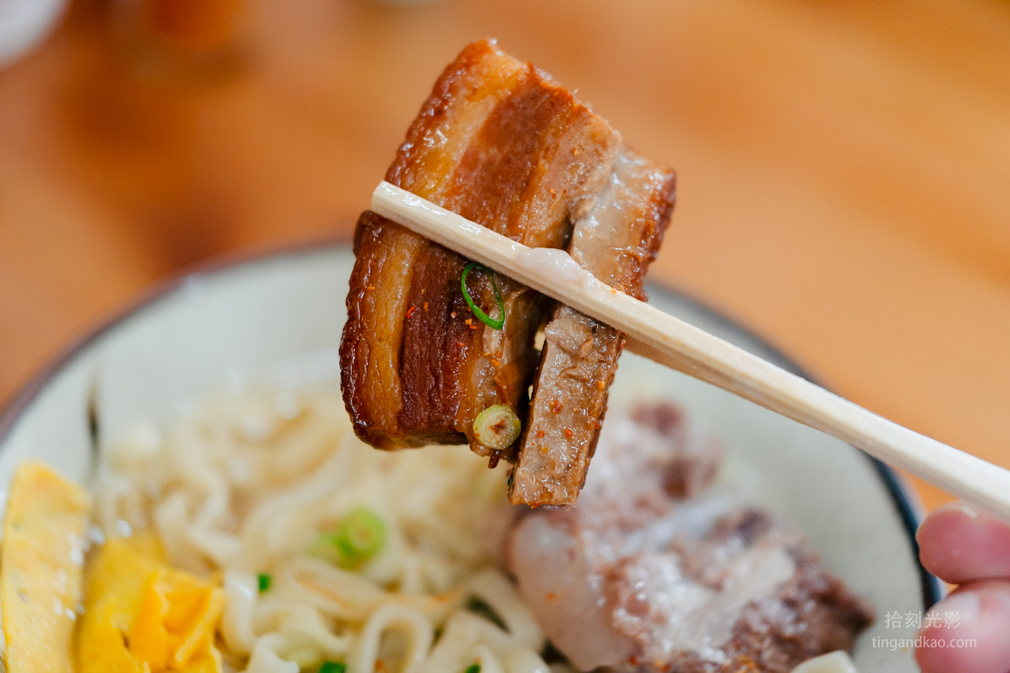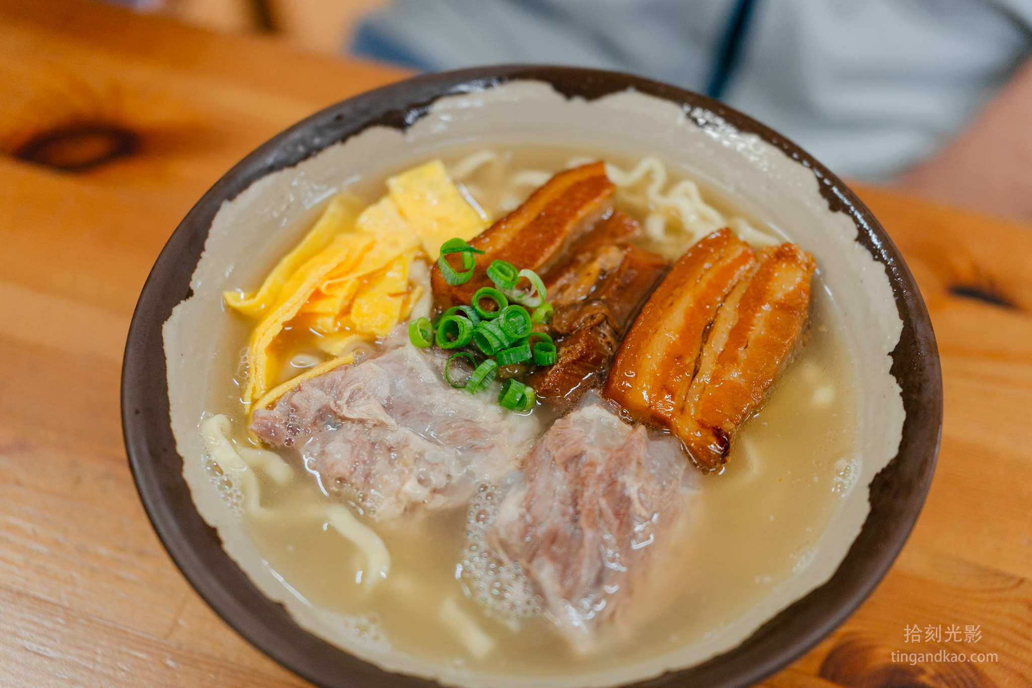 沖繩蕎麥麵裡有兩塊控肉和兩塊豬軟骨肉,撒上蔥花和蛋皮,湯頭使用雞豬熬煮,很夠味但不會過鹹。五花肉滷得入味,豬軟骨尤其驚艷,熬煮至入口即化。軟骨帶有膠質,食用時甚至會有點黏在口腔裡,是在台灣不曾吃過的豬軟骨,有夠嫩。