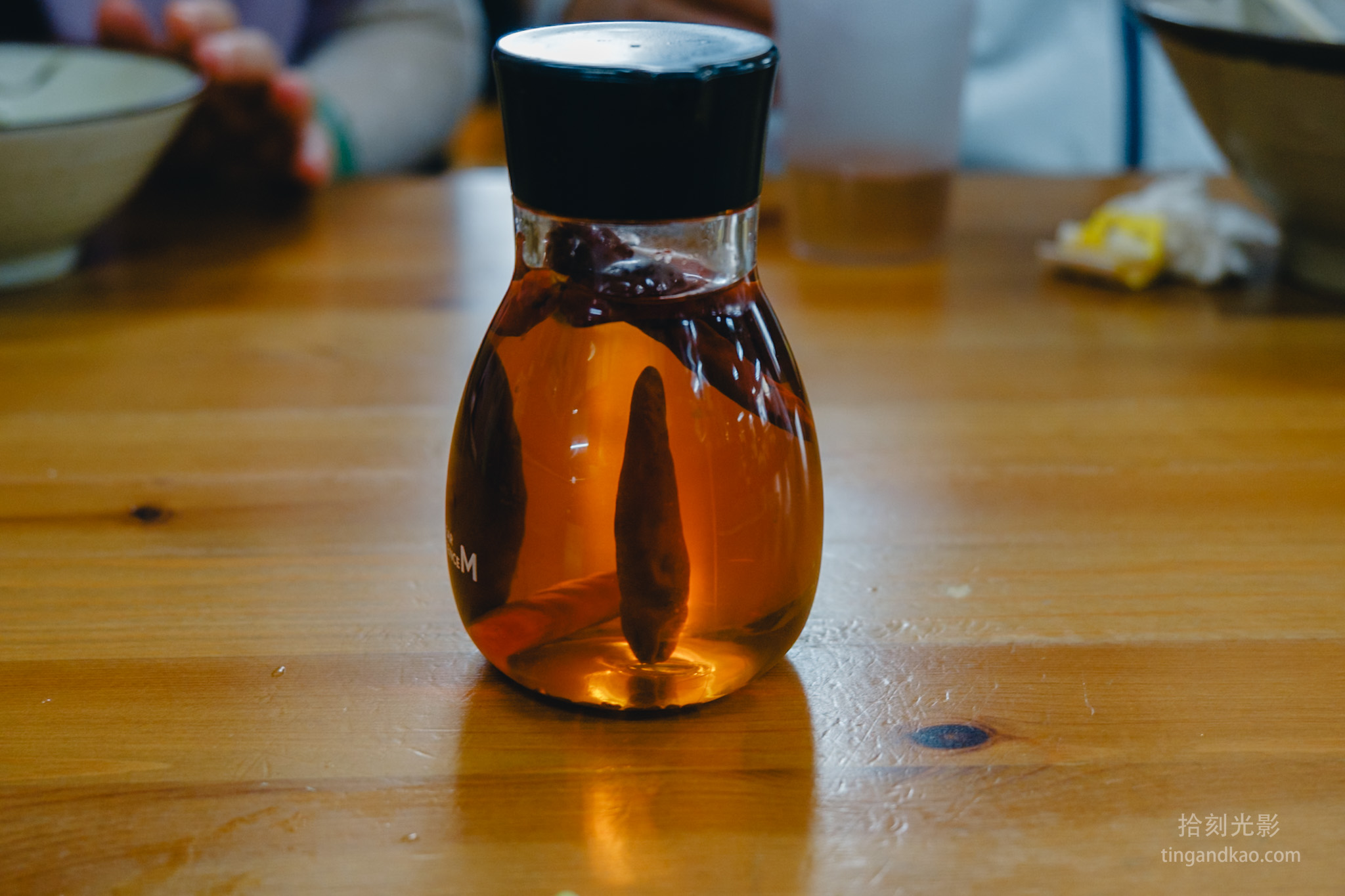 裡面共有三塊豬軟骨,麵條為帶有粗度的寬麵,吃起來有Q度,份量上可以選擇小碗或大碗。小碗適合食量比較少的人,食用時不要忘了添加沖繩特色醬料——泡盛辣椒。淋上去後湯頭多了一股香氣和辣度,是沖繩麵不可或缺的靈魂調味。