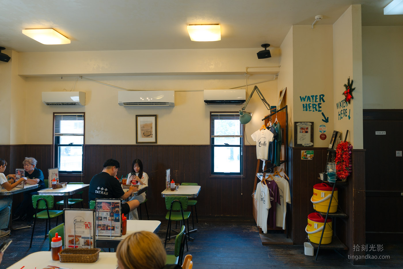店內裝潢走簡約風格,充滿美式餐廳的氛圍。美式風格的桌椅搭配牆上霓虹燈招牌,別有一番風味。