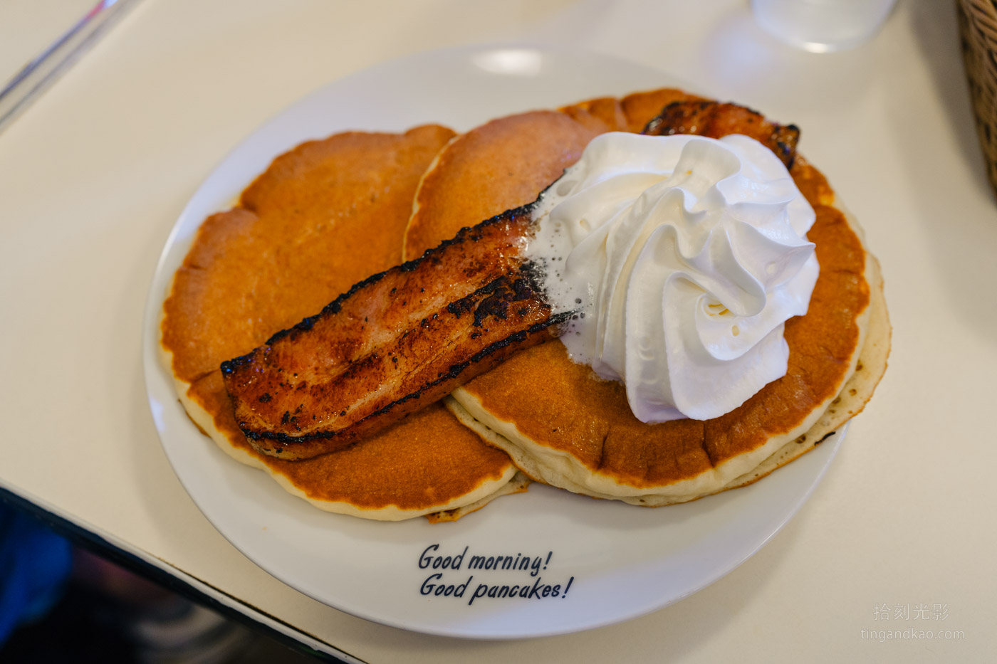 店裡的招牌是國王培根鬆餅,兩大塊鬆餅搭配一大塊厚實培根,以及一球鮮奶油,非常道地的美式組合。