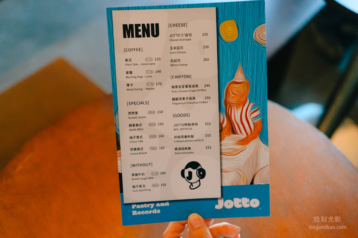 JOTTO pastry and records菜單如下,飲品有咖啡、美式、無咖啡因類。甜點則有起司類、戚風蛋糕和自製商品。
