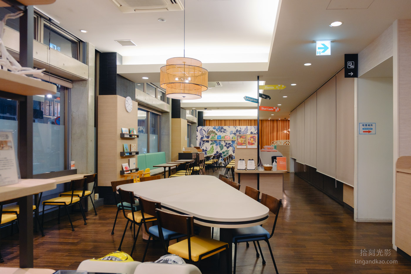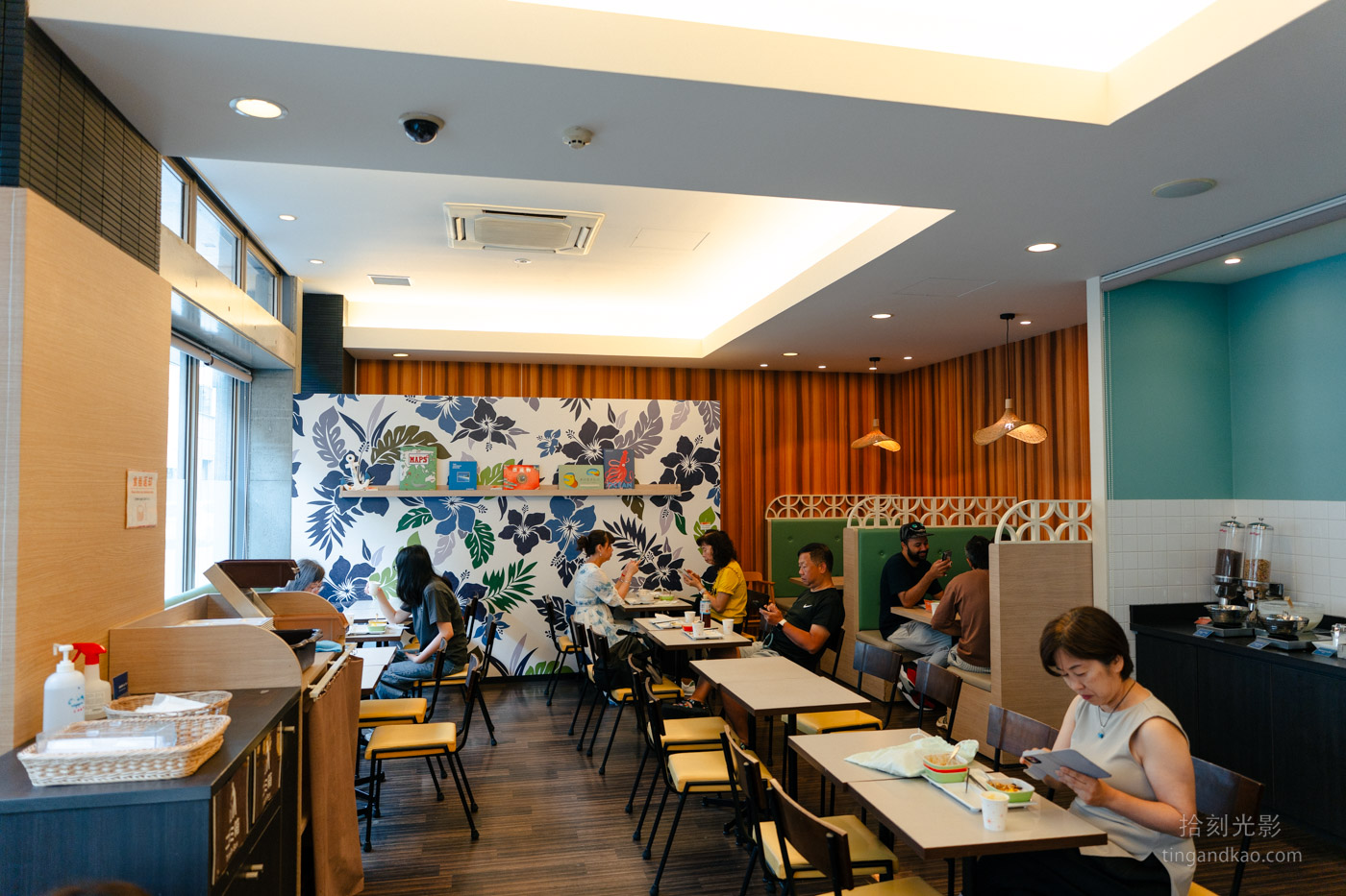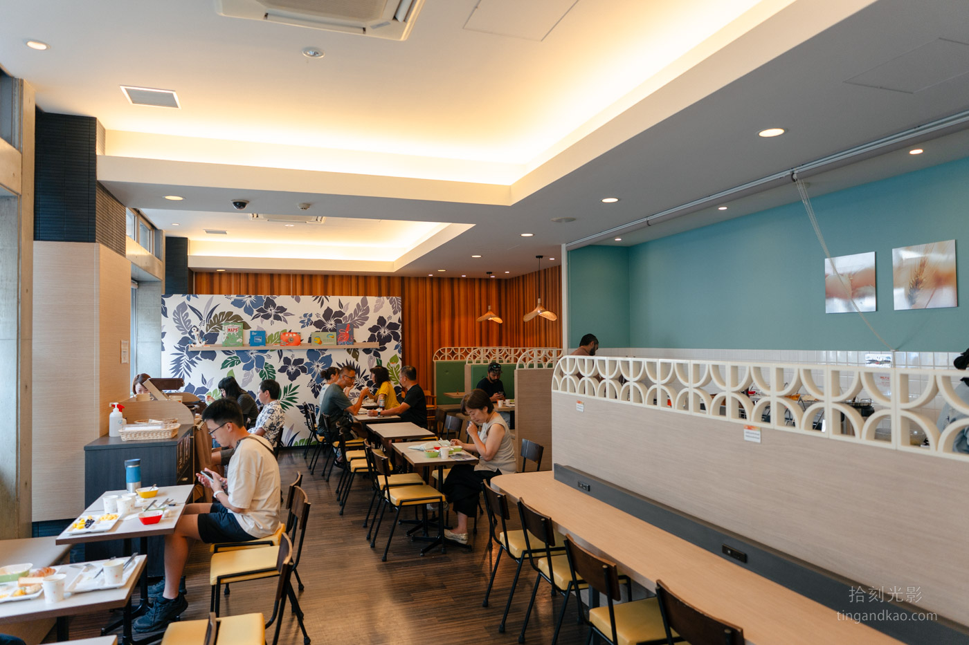 一樓空間作為早餐的用餐區,座位數量充足。用餐環境裝潢明亮色彩繽紛,牆面繪有扶桑花圖案,搭配明亮的黃色椅子,充滿沖繩的熱帶海島風情,讓人在享用早餐時也能感受到度假氛圍。
