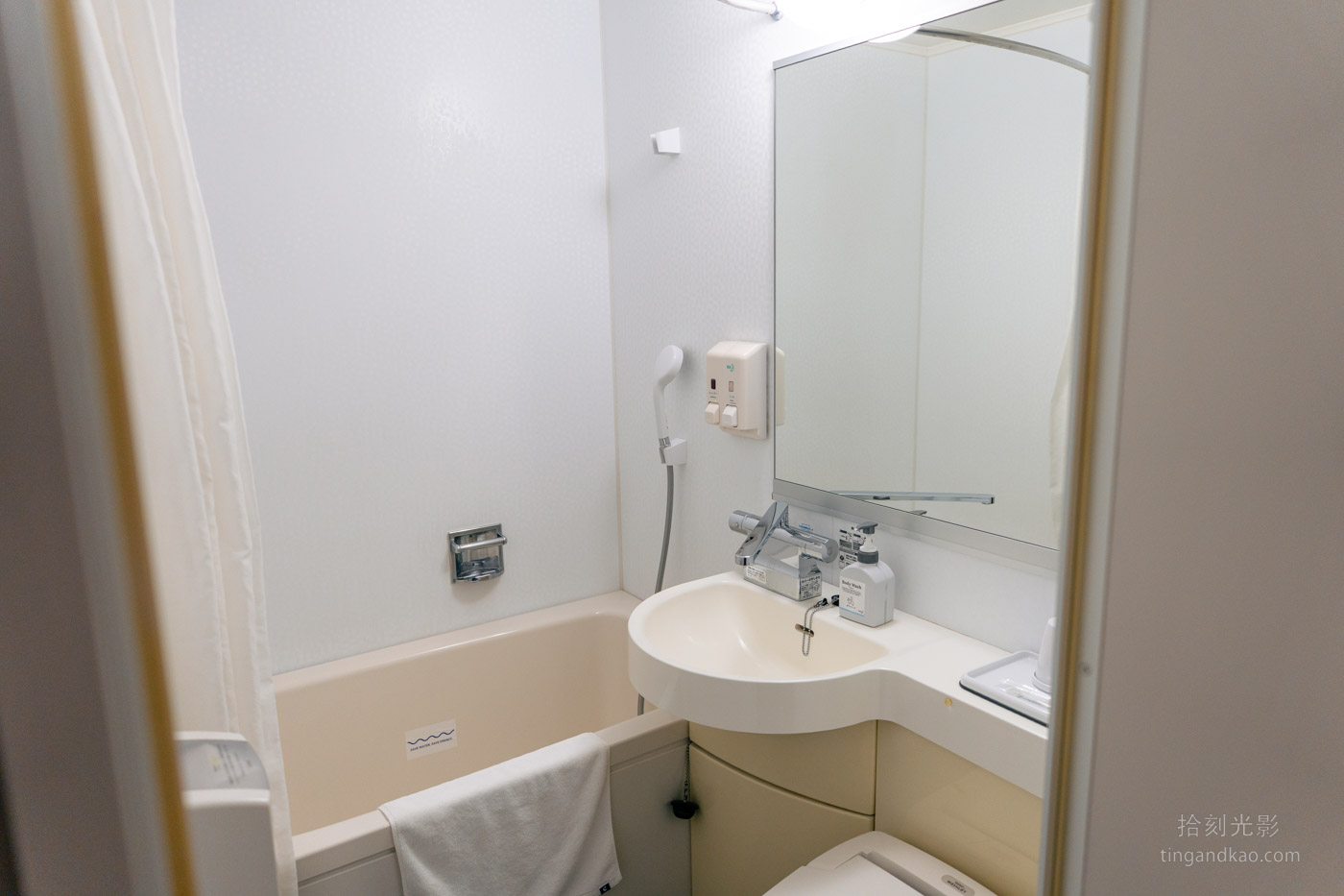 衛浴為日本飯店常見的一體式設計,雖然空間不大但仍設有浴缸,可以舒適地泡澡放鬆。