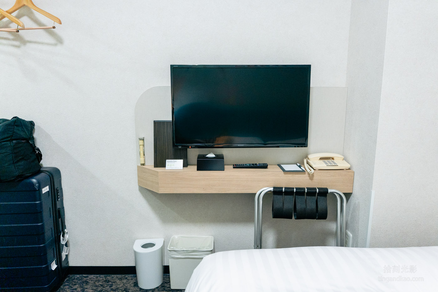 電視牆旁設有面紙、電話,並配置掛衣架方便掛放外套或衣物,地上則擺放回收桶和垃圾桶。