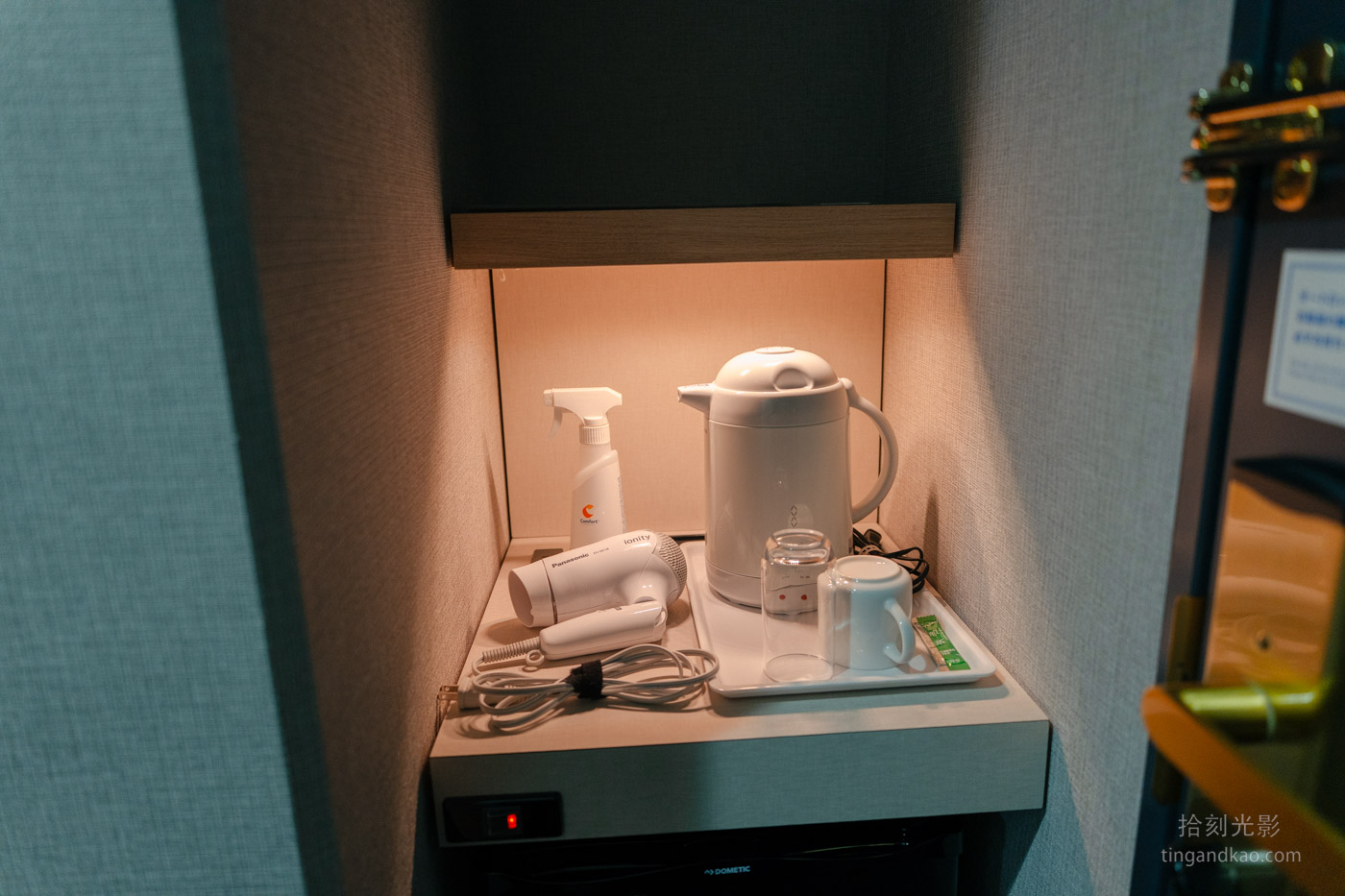 房間裝潢色系繽紛明亮,充滿朝氣。冰箱、熱水壺和吹風機等基本備品設置在進門旁,方便取用。