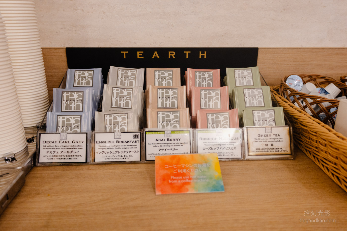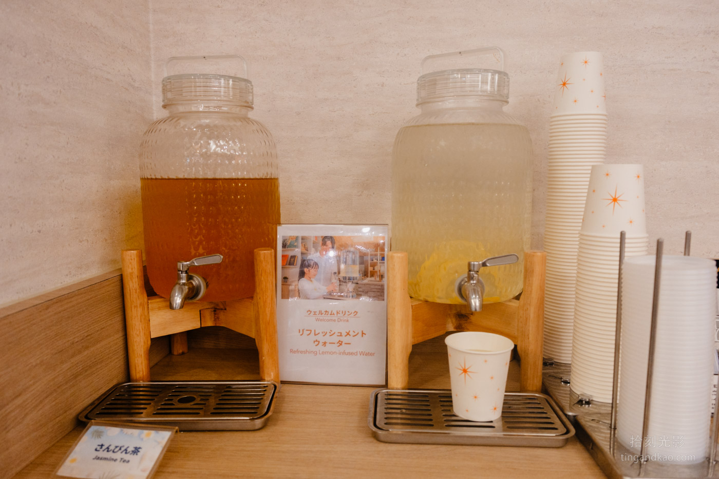 在書牆一旁設有迎賓飲品區,提供檸檬水和水果茶等冷飲,另外也備有茶包可以沖泡熱茶,讓旅客在辦理入住或休憩時都能享用免費飲品。