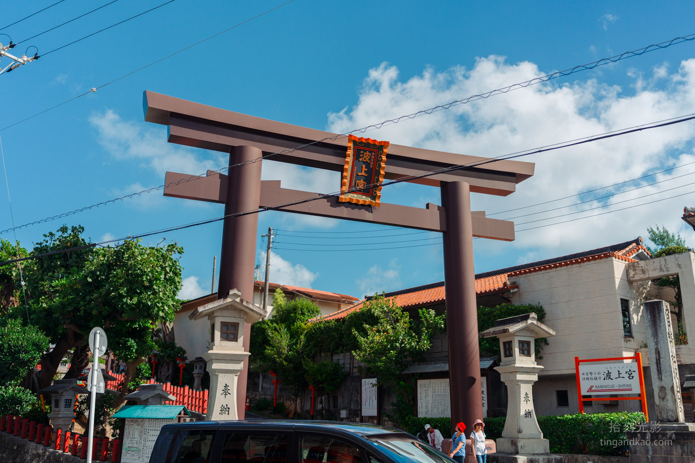 進入波上宮前會先看到佇立在入口的鳥居,穿過鳥居後需爬上一段長坡,上方有一小區停車位。波上宮占地不大。