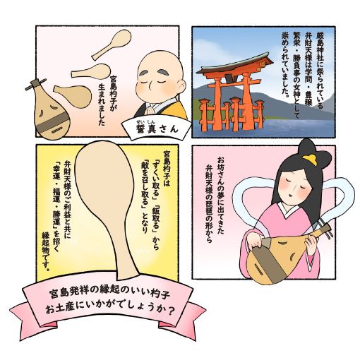 宮島飯勺起源於1800年左右,僧侶誓真夢見弁財天,從其手持的琵琶形狀獲得靈感而創造。