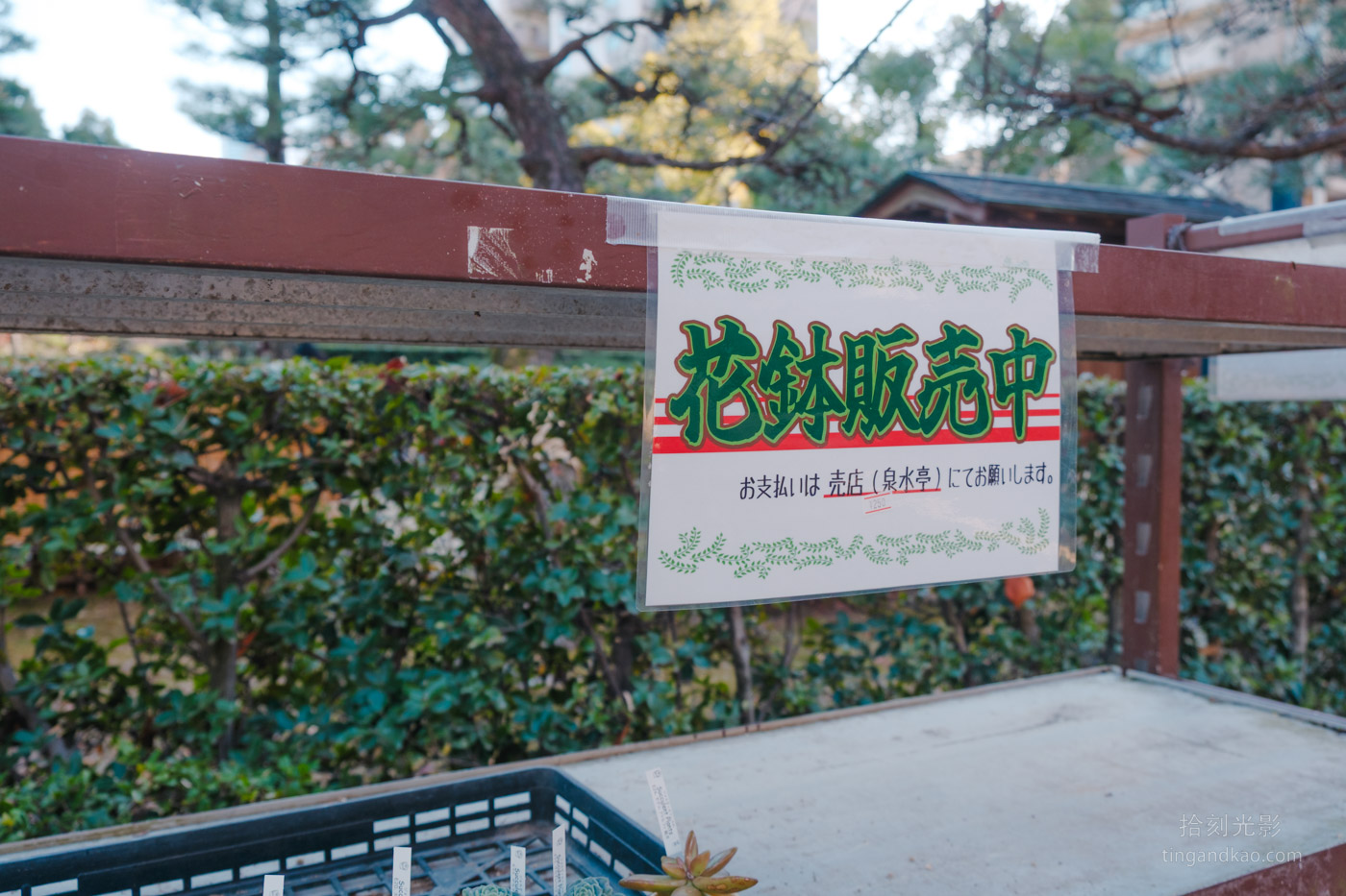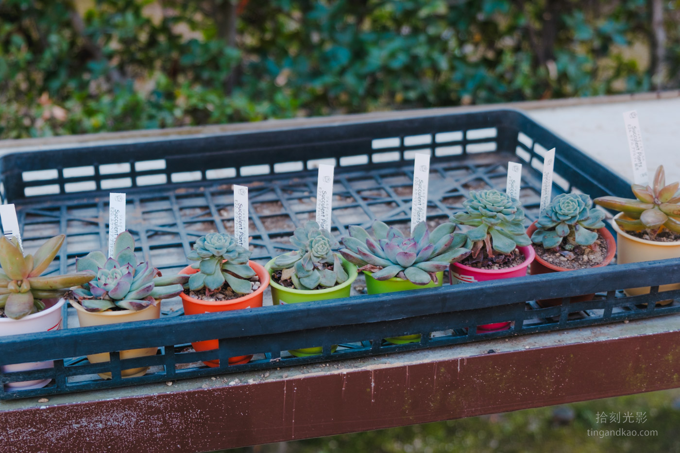 商店外面販售各種多肉植物的小盆栽。賣店外設有座位區,提供遊客休息和用餐的舒適空間。