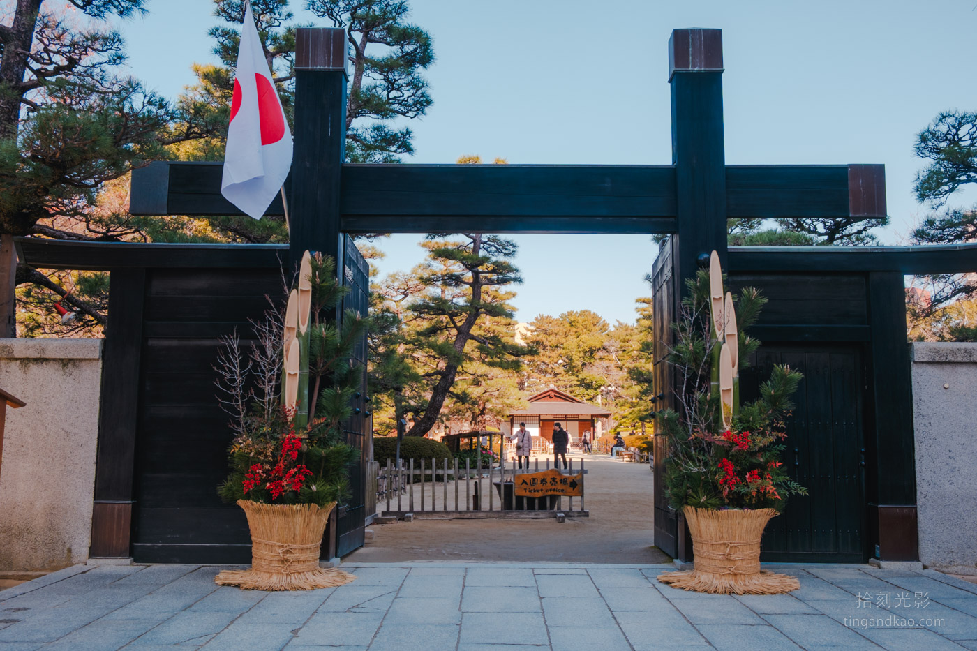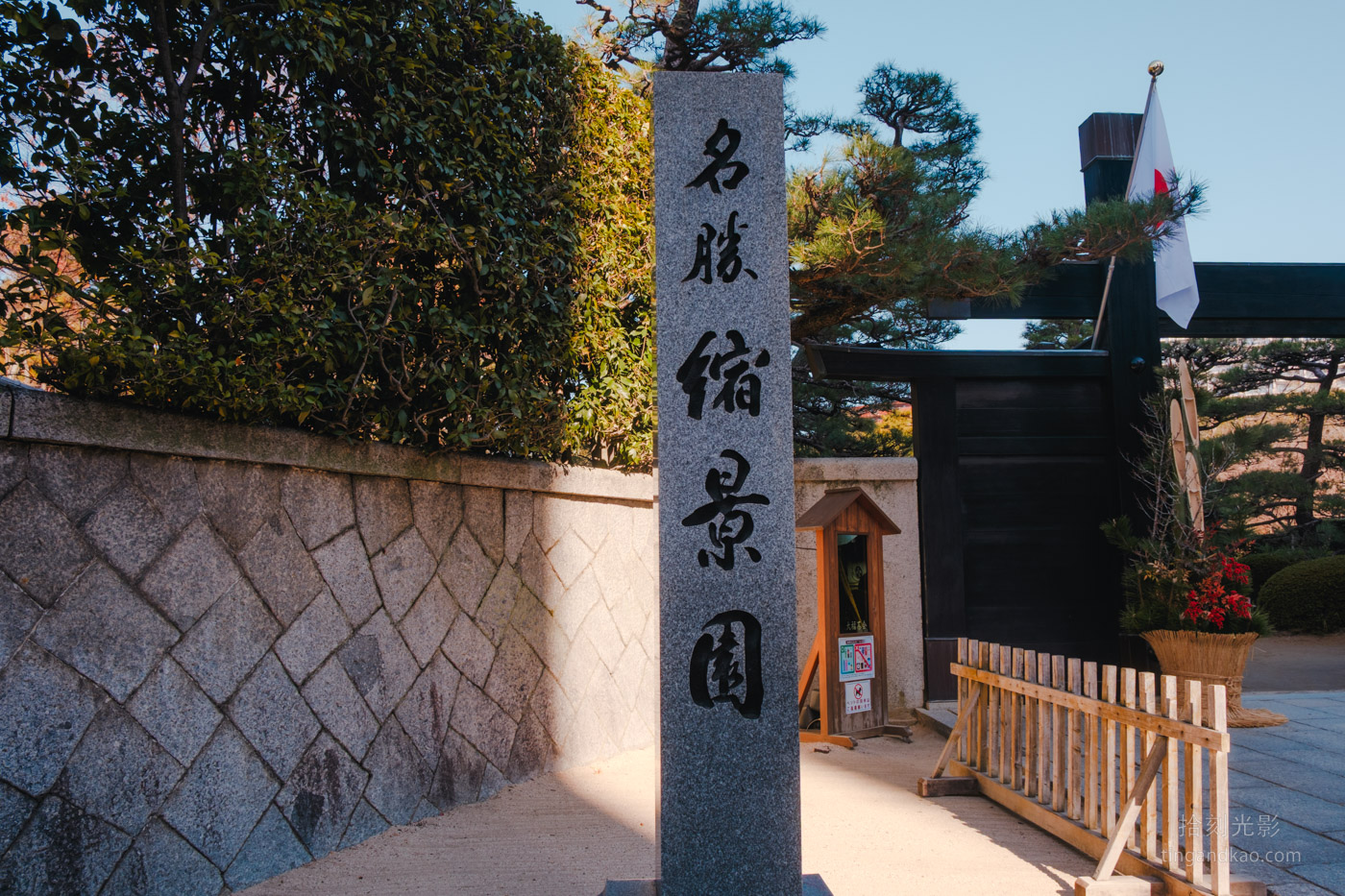 正值新年期間造訪,園區入口擺放著傳統的門松新年裝飾。入口處豎立著「廣島名勝縮景園」的石柱標示。